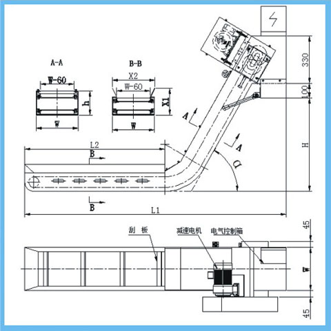 50刮板式排屑器输送长度在10米以内,排屑量在0.02~0.04m3/h。主要用于收集和输送小于30mm以下的切屑。广泛应用于各类数控机床加工中心和碎性生产线等自动化程度较高的机床。也是组合机床冷却液处理系统的主要排屑功能部件。该设备工作运转平稳、无噪音并配有机械过载保护和电器过载发讯保护装置,起到改善操作环境,减轻劳动强度,提高整机自动化程度的作用。是现代化工业生产中必不可少的机床辅机。